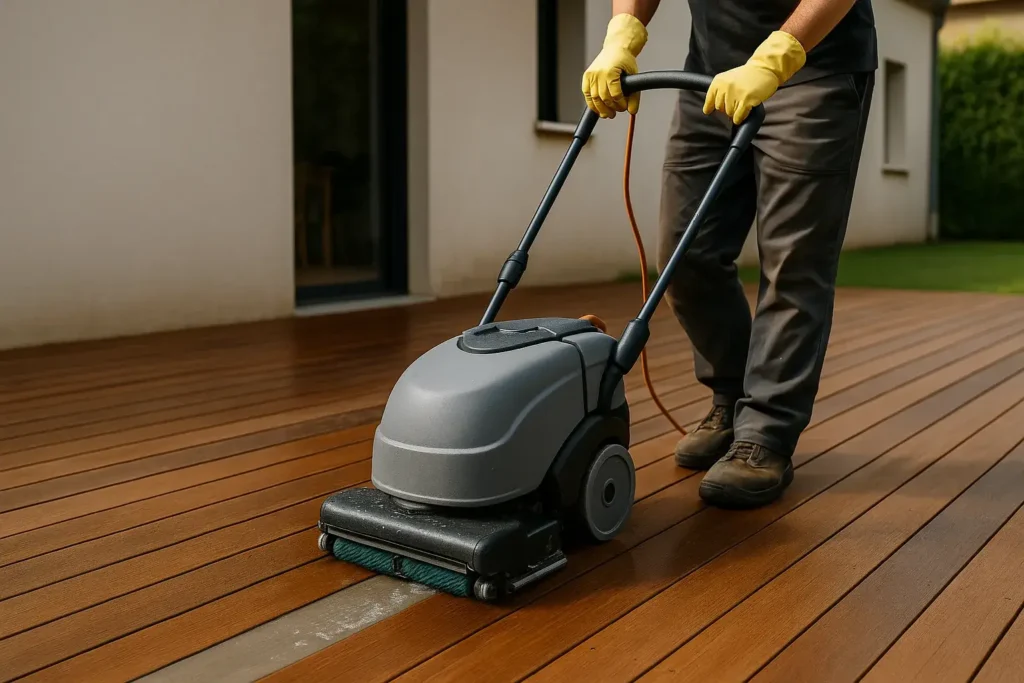 Avant toute application, nous nettoyons la terrasse en bois pour qu’elle absorbe parfaitement le saturateur. La surface doit être propre, sèche et uniforme.